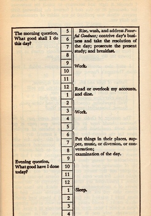 როგორც სურათიდან დაინახავთ, ფრანკლინს მხოლოდ 7 საათი ეძინა დღე-ღამეში. დილის 5 საათზე დგებოდა და განაწილებული ჰქონდა სხვადასხვა ამოცანები საათების მიხედვით.