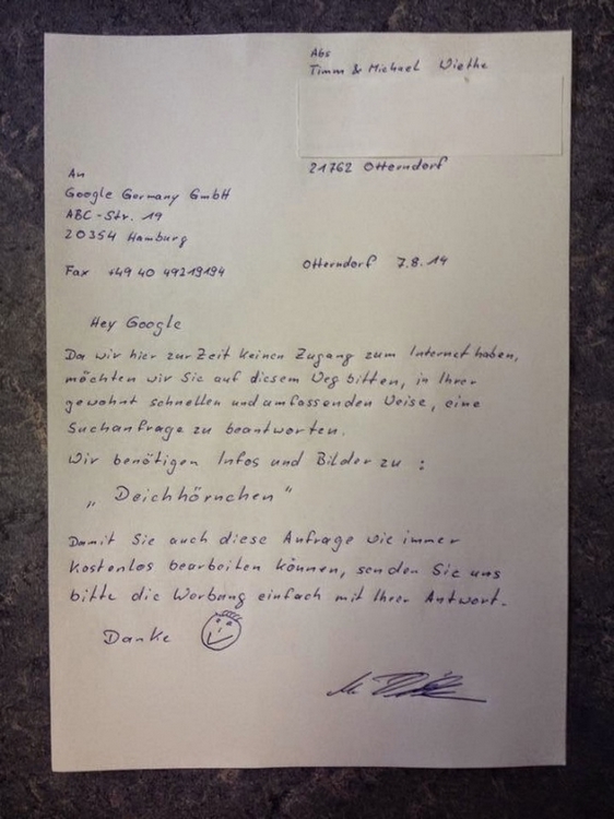 მამა-შვილი ტიმი და მაიკლი იმყოფებოდნენ საზაფხულო ბანაკში, როდესაც მათ დასჭირდათ ინფორმაცია სიტყვაზე Deichhörnchen. რადგან ინტერნეტი არ ჰქონდათ, გადაწყვიტეს შეკითხვა Google-ისთვის გაეგზავნათ არასტანდარტული მეთოდით — ფოსტით. ხელით დაწერილი წერილი ჰამბურგში გააგზავნეს და კვირაზე ნაკლებ დროში მათ მოუვიდათ პასუხი, რომელიც ასევე ხელით იყო დაწერილი.