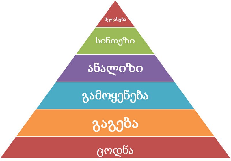 – სწავლა მოიცავს შემდეგ ეტაპებს: ცოდნა, გაგება, გამოყენება, ანალიზი, სინთეზი, შეფასება. – თქვა პროფესორმა სწავლის ეტაპები და კიდევ ერთხელ მოავლო აუდიტორიას თვალი.