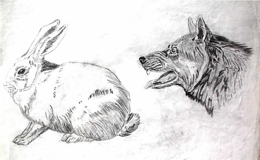 წაიყვანა მგელი კურდღელმა და ცოტა ხანში მარტო დაბრუნდა, გააგრძელა წერა, გამოიარა დათვმა, ეკითხება კურდღელს.