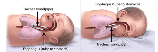 სურათზე ჩანს, რომ ზურგზე ძილი, პირიქით, ხელს უწყობს ღებინების მასებისგან გათავისუფლებას. ზურგზე წოლის მდგომარეობაში, ტრაქეა საყლაპავ მილზე მაღლა იმყოფება. ანუ, თუ ბავშვმა ამოაღებინა, სითხემ გრავიტაციის წინააღმდეგ, მაღლა მიმართულებით უნდა იმოძრაოს, რომ სასუნთქ გზებში შეაღწიოს. მუცელზე წოლის შემთხვევაში კი ტრაქეა საყლაპავი მილის დაბლა გვევლინება, რაც ღებინების მასების სასუნთქ გზებში შეღწევას უფრო შესაძლებელს ხდის. მაშასადამე, დახჩობის არანაირი საშიშროება არ არსებობს, თუ ბავშვს საჭმლის მიღების შემდეგ ამოაბოყინებინებთ, დააწვენთ ზურგზე და მიაქცევთ ყურადღებას, რომ მისი კისერი არ იყოს შეხვეული და თავისუფლად მოძრაობდეს, რათა ღებინების დროს თავი რეფლექსურად გვერდით გასწიოს. რასაკვირველია, იმ შემთხვევაში, თუ ბავშვს გააჩნია სერიოზული კუჭ-ნაწლავის პრობლემები, როგორიცაა გასტროეზოფაგეალური რეფლუქსი, მისი ძილის პოზა ექიმს უნდა შეუთანხმოთ.