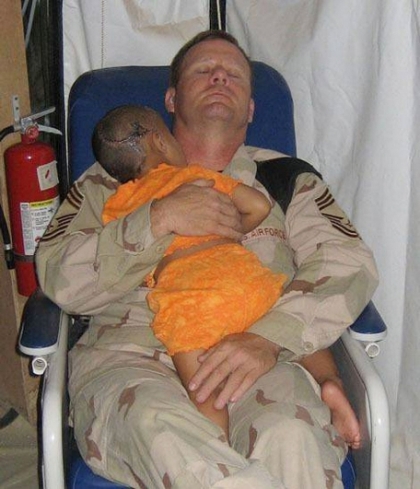 ერაყში მოღვაწე ამერიკელმა სამხედრო მოსამსახურემ ეს ფოტო ცოლს გაუგზავნა, მინაწერით: “ეს პატარა ობოლია, მისი მშობლები ჩამოახრჩვეს, მხოლოდ გოგონას გადარჩენა მოვახერხეთ… მძიმედ იყო დაშავებული… მალე გამოჯანმრთელდა, მაგრამ სულ ტირის. მხოლოდ მაშინ ჩუმდება, როცა ხელში ამყავს და მკერდზე ვიხუტებ, მიჭირს პატარის მიტოვება, ამიტომ მეოთხე დღეა, მასთან ერთად ვიძინებ და ვიღვიძებ”.